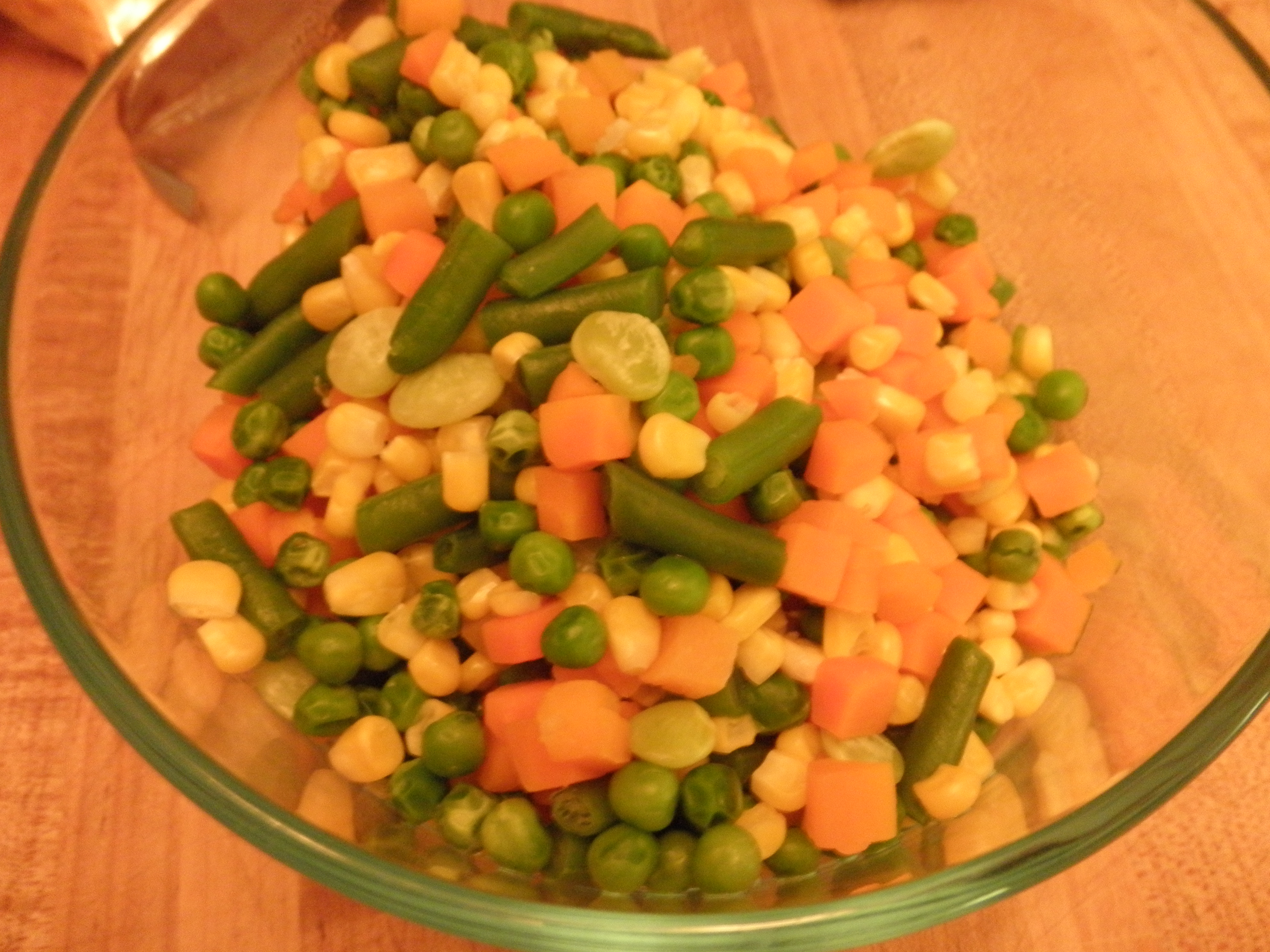 Second, while the onion/hamburg mixture is cooking, nuke a bag of mixed frozen veggies with a couple tablespoons of water in the microwave for about 8 minutes.