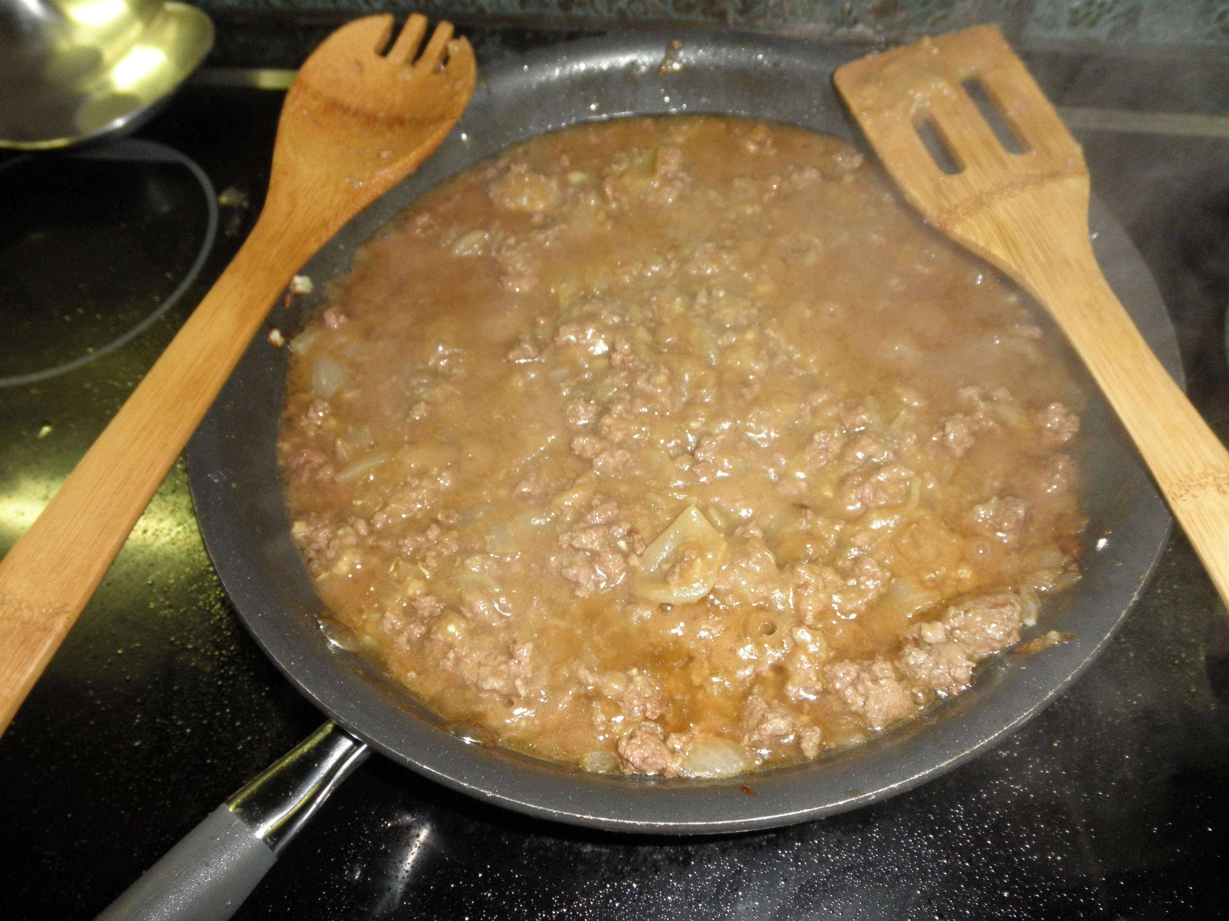 After your hamburg cooks, add a container of beef broth (about 16 oz) and cook for 5 minutes.  I recommend a hearty beef stock that will pump up the flavor.