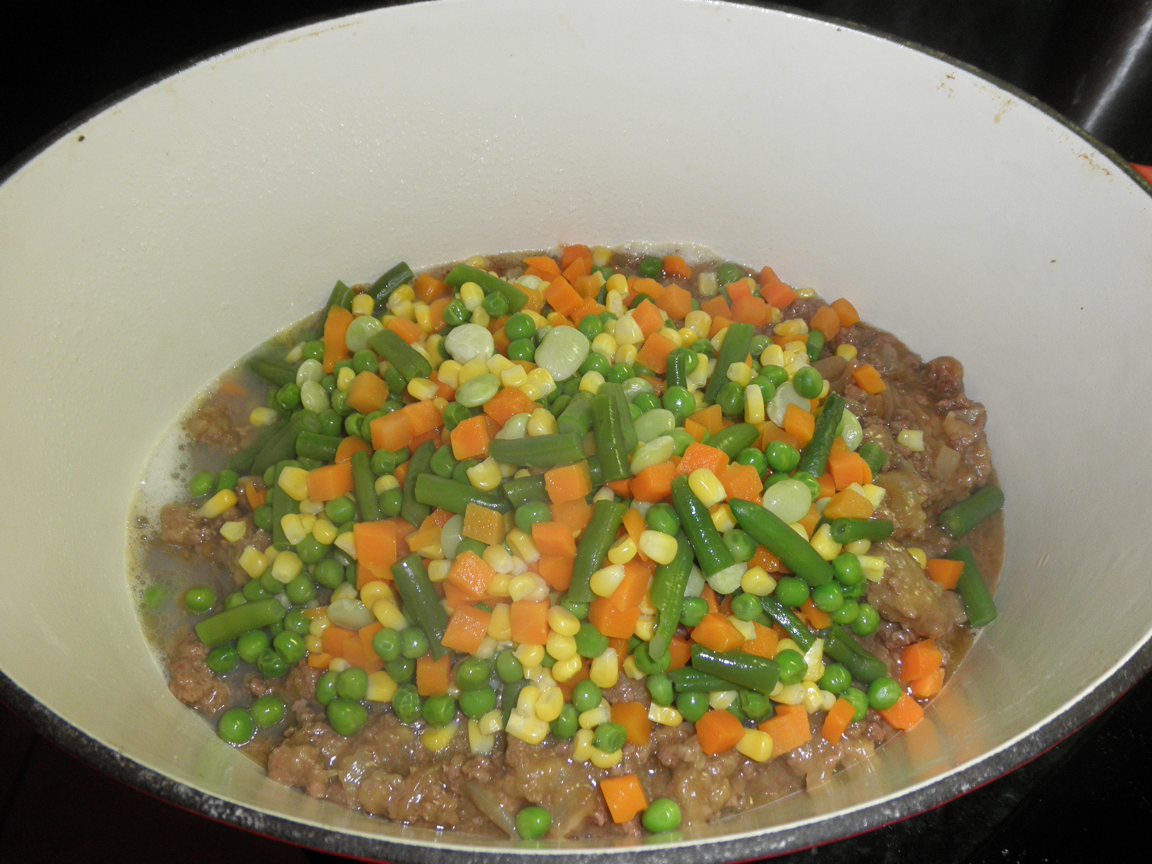 At this point, add the beef mixture into your dutch oven or bake dish that you have already prepped with non-stick spray.  Then, add your veggies.