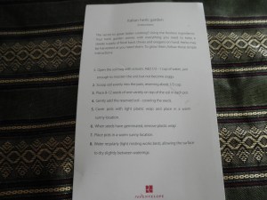 Of course, you don’t need a kit to plant fresh yummy herbs in the house.  You can make your own kit by getting a bag of soil, some small containers with tray, and some seeds for herbs – I recommend chives, oregano, and basil, but get whatever you think is best.