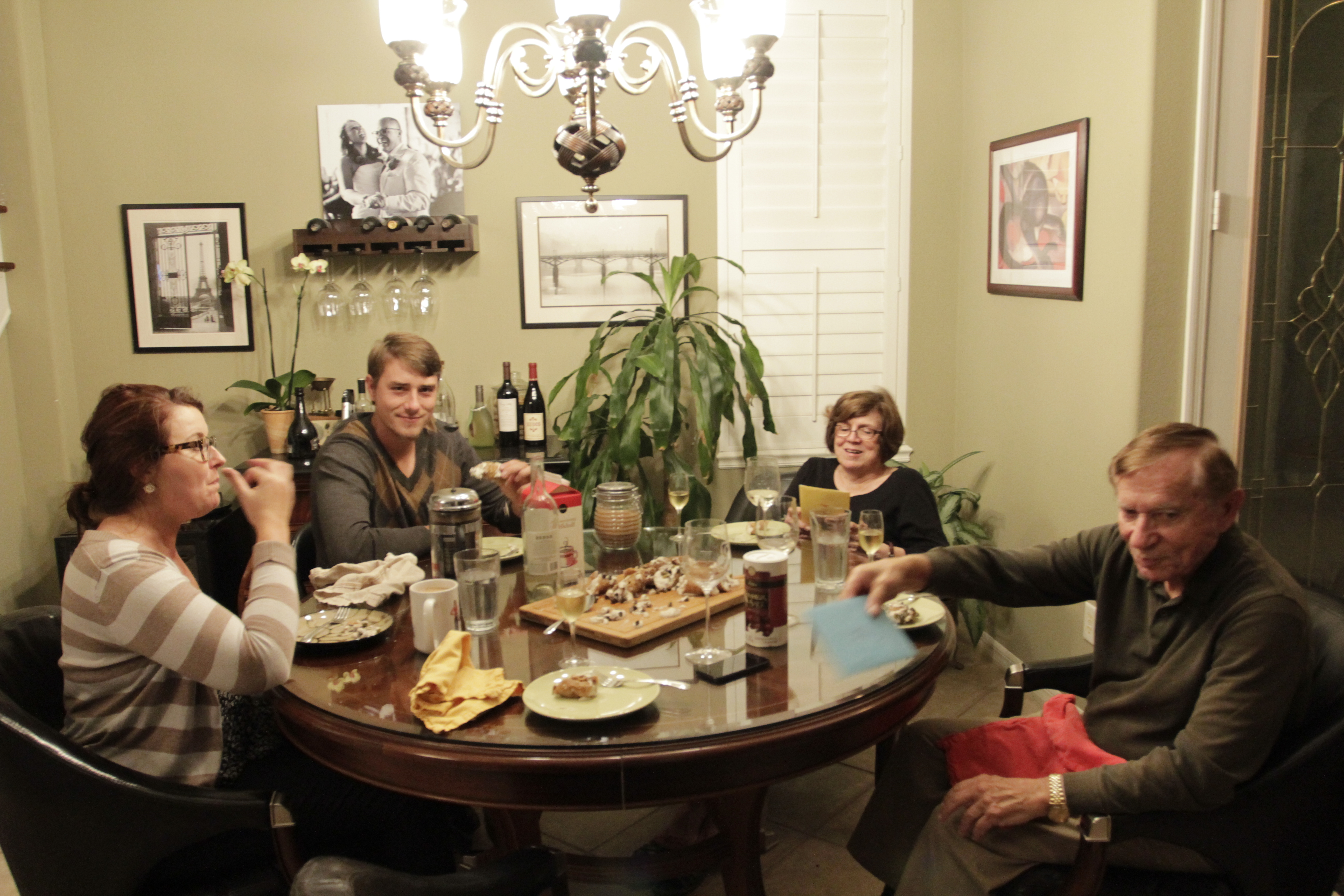 Here’s everyone enjoying dessert (L to R – me, my brother Allen, my mother-in-law Jo Ann, and my father-in-law Phil a/k/a Big Phil). In the end, the in-laws and my brother didn’t know that I didn’t make the protein I intended. Remember to breath and go with the flow and adapt when you’re hosting. It’s about getting together and enjoying each others’ company. The food is always secondary.