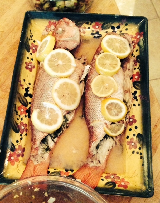 Feeling awfully ambitious, I also picked up two whole snappers at Fresh Market. Here’s a fantastic recipe. I used dill instead of thyme and was very fresh and tasty.