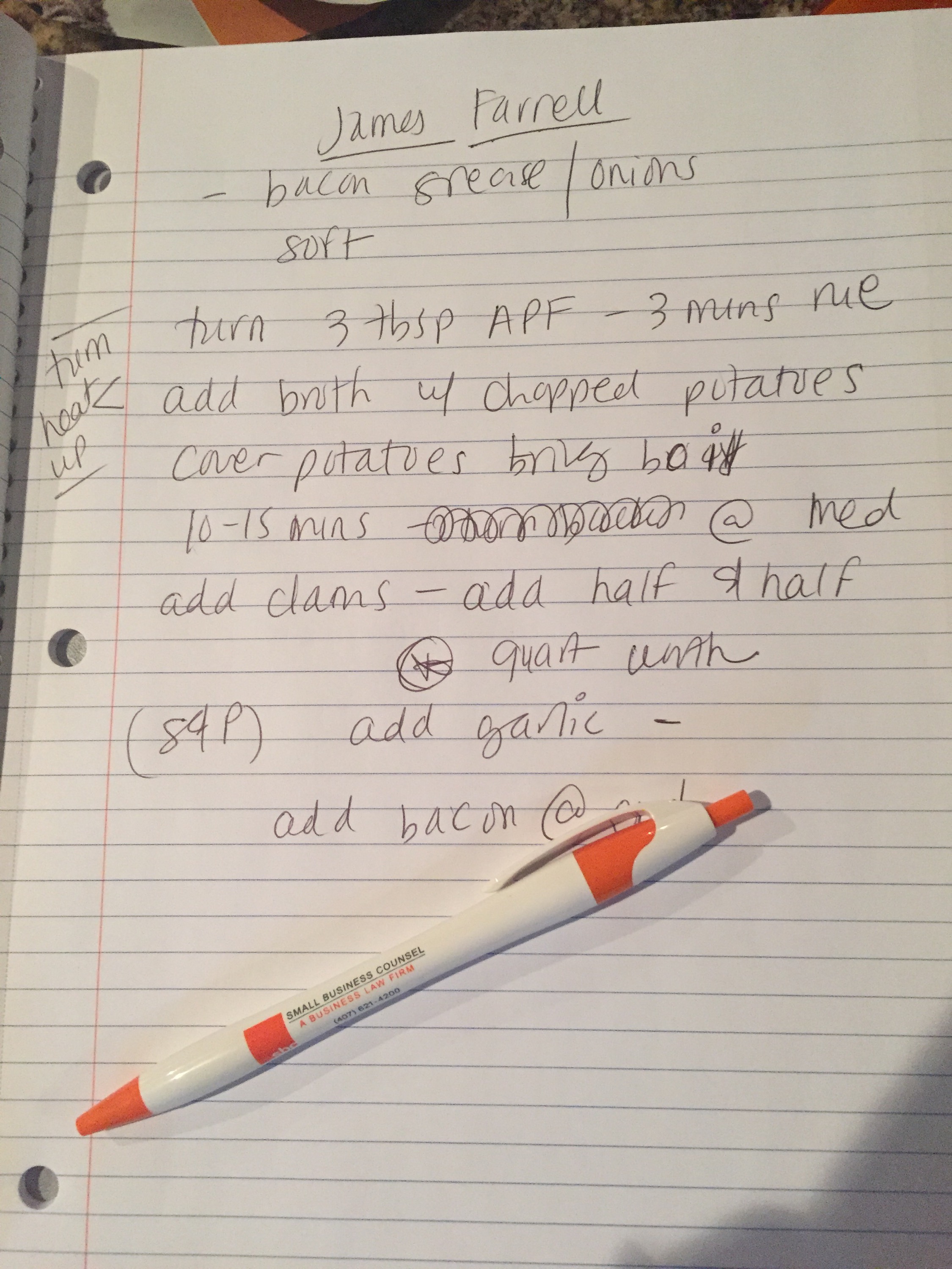 On a break during the third quarter of the Cowboys/Patriots game, I gave James a ring and scribbled down these notes, which has been used as the basis for the recipe below.