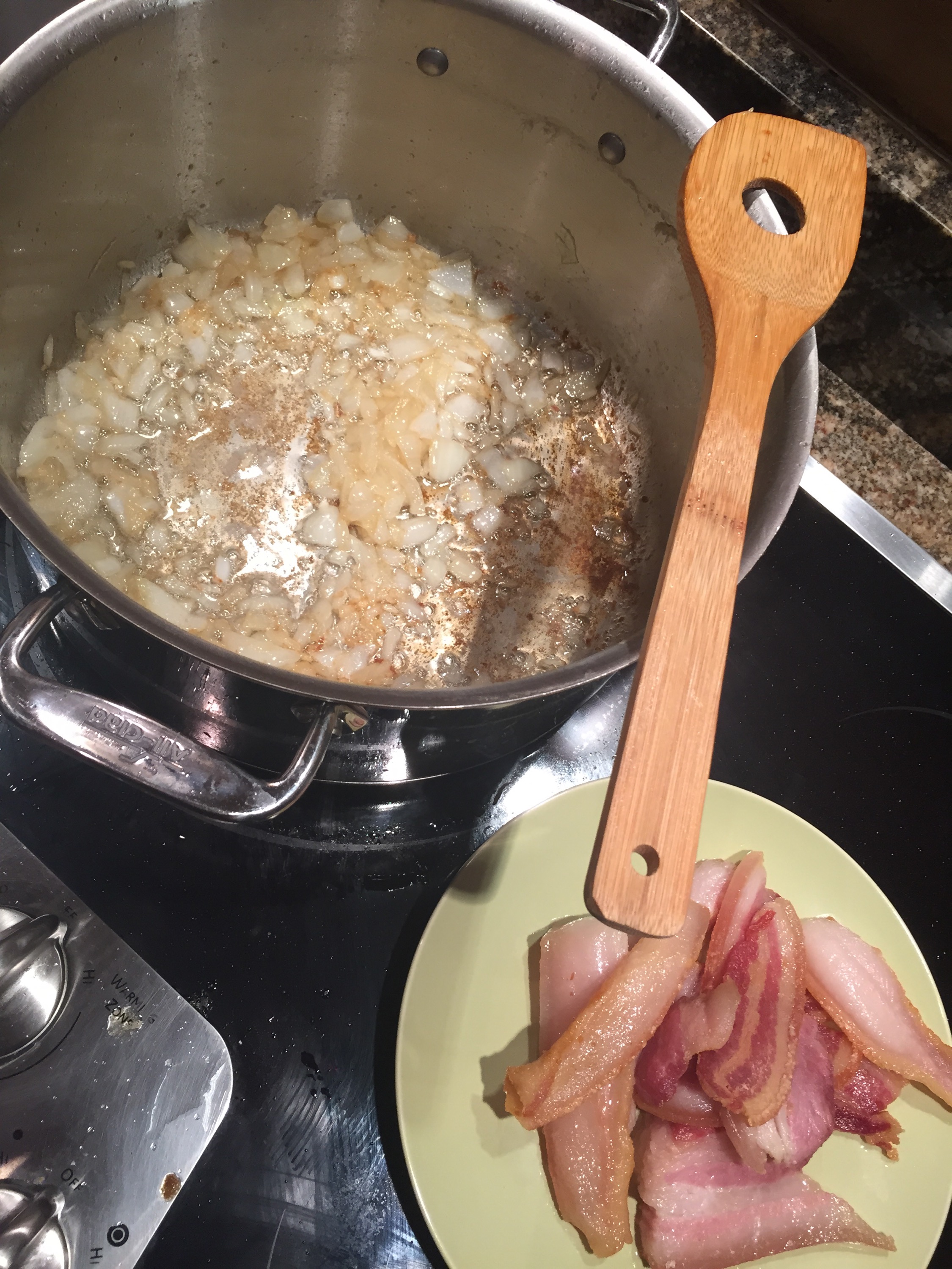 Put the salt pork to the side so it cools.  Add the chopped onion to the pork fat and cook until translucent.  Add garlic and cook until fragrant and softened.