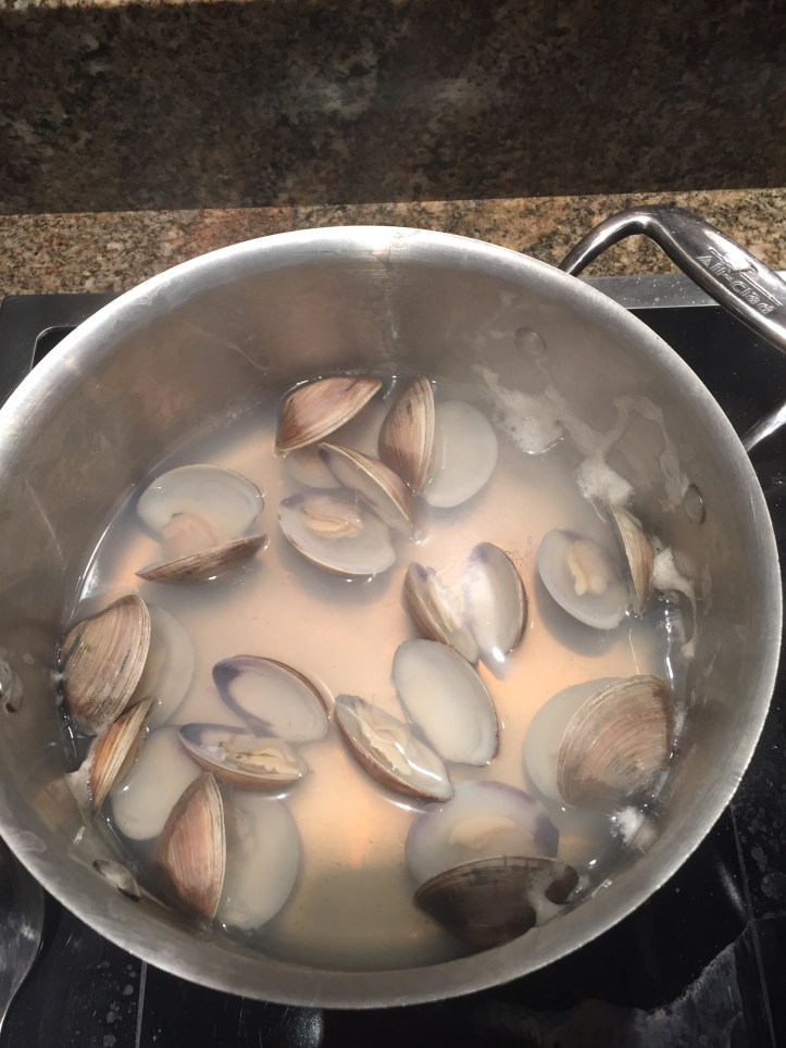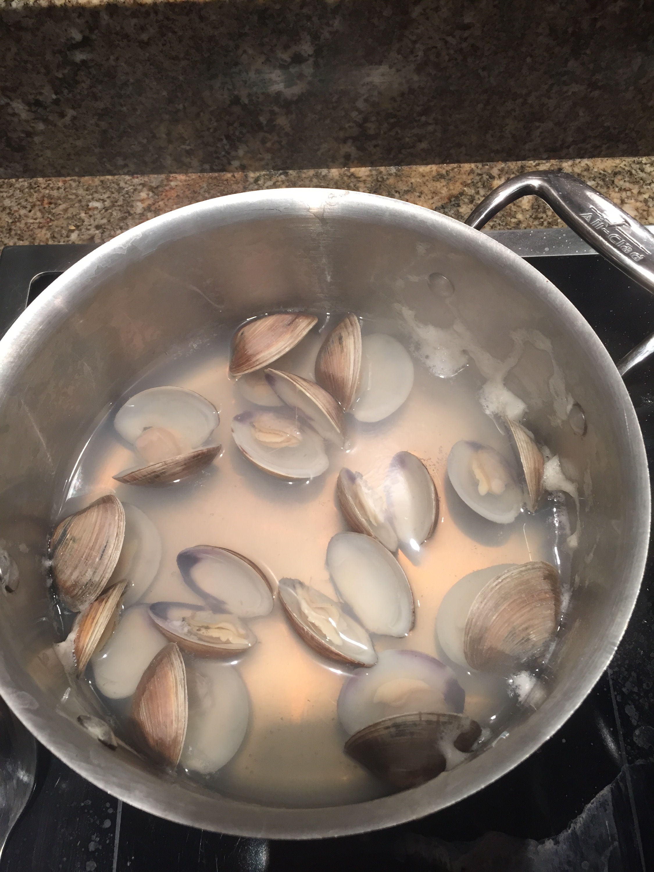 First, if you are using fresh clams.  Rinse and clean the clams and put in a bowl of water in your fridge for 30 minutes to release any grit.