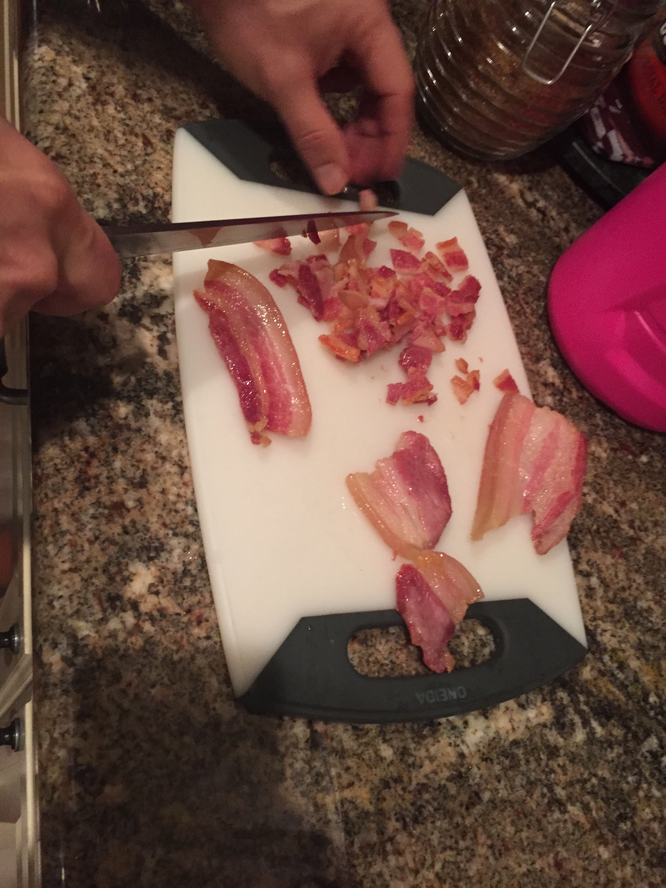 step six: Add half and half and some bacon. (I usually chop half of the bacon I cooked