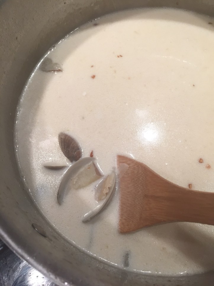 Add your canned clams and your fresh clams with two ladles of the juice made by the steamed clams (if applicable).  Pour your quart of half and half into the mixture.  Stir.