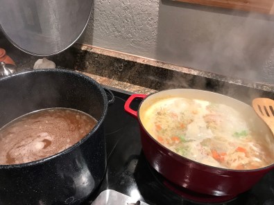 - Skim fat from broth. Cover and bring to a boil. Reduce heat to a simmer. Meanwhile, in a Dutch oven, bring 3 qts. water to a boil.